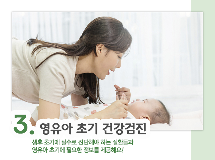 또한, 부모교육도 함께 진행하여 모유 수유, 카시트 사용, 영아돌연사 증후군 예방 등 영유아 초기에 필요한정보를 제공합니다. 또한 코로나 19 확진자 증가 상황을 고려하여, 기존 영유아 건강검진과 동일하게 영유아 초기 건강검진도 다음 검진(생후 4~6개월)전까지 검진기간을 유예하여 검진을 받을 수 있습니다.