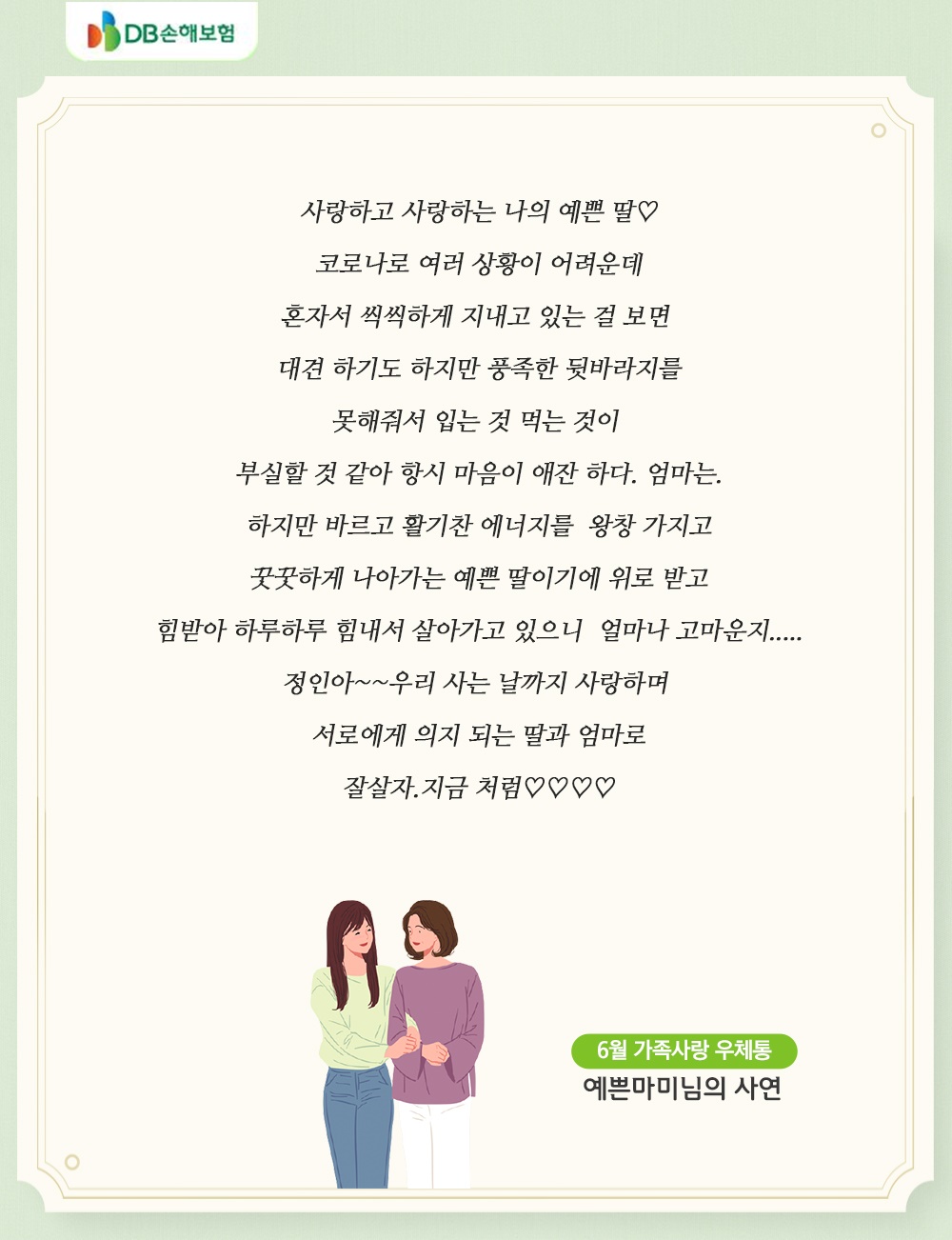 지금까지 DB손해보험 가족사랑 우체통 베스트 사연을 함께 살펴보았습니다. 이번 가족사랑 우체통 편지에서는 6월을 맞아 가족들에게 사랑을 전하는 가족메시지들을 볼 수 있었는데요. 아직 가족들에게 마음을 전하지 못했다면 가족사랑 우체통 편지를 보내 보는 건 어떨까요?