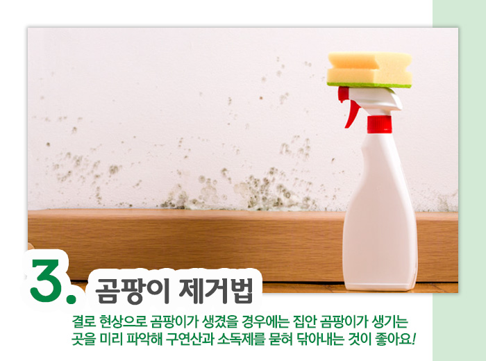 결로 현상으로 이미 곰팡이가 생겼을 경우에는 빠른 발견과 대처가 가장 중요한데요. 집안에서 곰팡이가 잘 생기는 곳을 파악해두었다가 2~3일에 한 번씩 주기적으로 상태를 확인하며 가볍게 구연산(물과 1: 10 비율로 희석)과 염소계 소독제(락스)를 묻혀 닦아내시면 곰팡이를 제거할 수 있습니다.