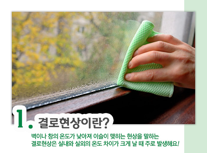 실내와 실외의 온도 차이가 크게 나거나 내부 습도가 상당히 높을 때 주로 발생합니다. 결로 현상이 지속적으로 발생하면 습기를 머금은 벽지나 창문 틈에 곰팡이가 발생할 수 있기 때문에 특히 주의하셔야 해요.