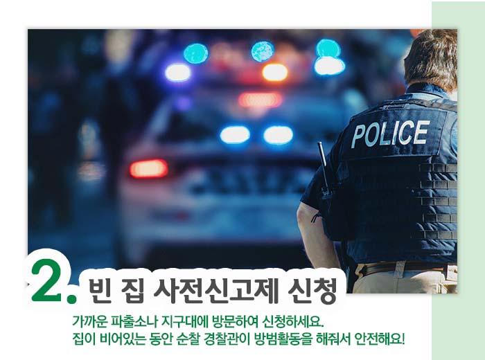 ‘빈 집 사전신고제’는 집을 비울 경우, 사전신고를 하면 해당 지역 순찰 경찰관이 특별 방범 진단 대상에 포함시켜 방범활동을 해주는 제도인데요.오래 집을 비우게 될 경우엔 집을 비우기 3일 전, 가까운 파출소나 지구대에 방문하여 ‘빈 집 사전신고제’를 추천드립니다!