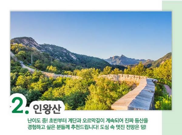 인왕산 역시 멋진 뷰를 볼 수 있는 곳인데요. 정상 바로 직전에 천국의 계단이라고 불리는 가파른 계단만 견디면, 멋진 도심 전망을 볼 수 있다고 해요. 적절한 운동과 예쁜 인증샷을 모두 원하시는 분께 추천드릴게요.