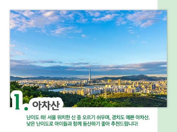 아차산의 해발고도 약 295m로 서울에 위치한 산 중 가장 오르기 쉬운 산입니다.난이도에 따른 코스가 다양하여 아차산역, 광나루역 등 등산 시작 지점을 편한대로 고를 수 있다는 장점도 있습니다. 따라서 아이들과 함께 가기 좋은 산으로 추천드립니다!