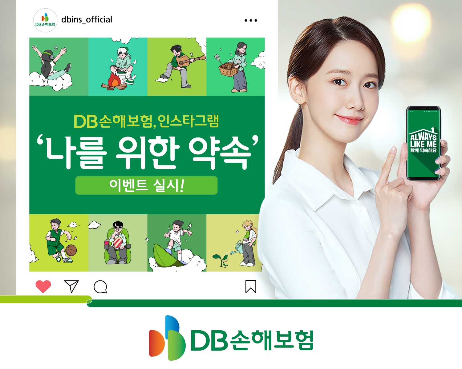 DB손해보험 인스타그램의 7월 콘셉트인 “함께, 약속 – Always Like Me”는 가정, 친구, 직장, 사회에서 맡은 역할을 충실히 수행하고 있는 ‘나’가 모든 약속의 중심이며, 앞으로도 꾸준히 지켜가고 싶은 '나'의 모습을 응원하는 마음을 담고 있습니다.