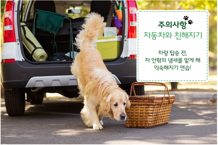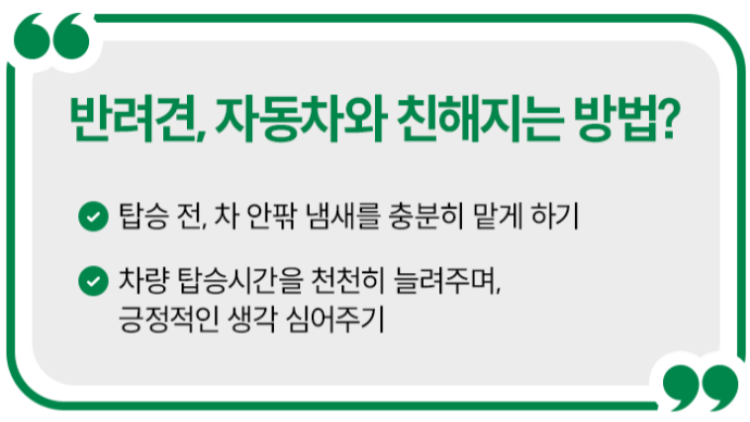 때문에 자동차를 탑승하기 전, 반려견이 자동차에 적응할 수 있도록 차 안팎 냄새를 충분히 맡게 해주세요. 좌석에 직접 탑승하게 해보는 것도 좋고요. 1분, 5분, 10분 이렇게 차량에 탑승하는 시간을 천천히 늘려주는 것도 반려견이 차량을 빠르게 적응하는 데 큰 도움이 될 거예요!