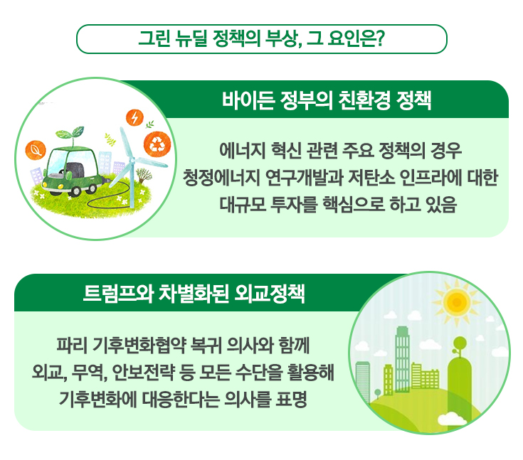 우리나라 정부가 야심하게 추진 중인 그린 뉴딜 정책도 상당부문 바이든의 청정에너지 인프라 계획과 상당부문 일치하고 있고, 전세계적으로 친환경 에너지로의 전환 속도가 빨라질 것이라는 점에서 그린 뉴딜 정책은 더욱 힘을 받을 전망입니다.
