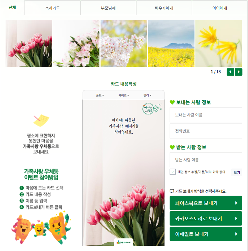 가족사랑 우체통 카드 보내기 참여 방법을 알아볼까요? 가족에게 전하고 싶은 말을 담은 편지지 한 장을 선택하고 가족에게 하고 싶었던 이야기들을 적어주세요. 예쁜 일러스트로 구성된 봄 느낌 가득한 카드도 있답니다. 메시지를 적은 후 카카오톡, 페이스북, 이메일 등 원하는 방식을 선택해서 전송하면 끝이랍니다.