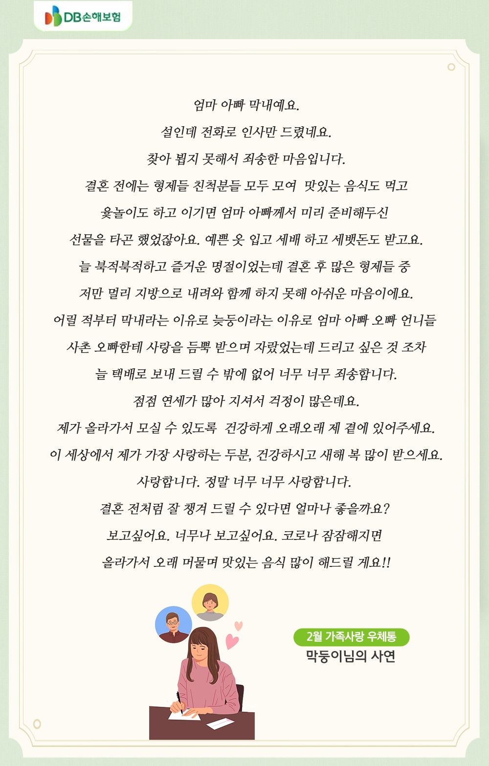 지금까지 DB손해보험 가족사랑 우체통 베스트 사연을 함께 살펴보았어요. 이번 가족사랑 우체통 편지에서는 이전처럼 가족들과의 행복한 일상을 꿈꾸는 가족메시지들을 볼 수 있었습니다. 올해는 코로나 종식과 함께 가족들과의 평범하지만 행복했던 시간들이 돌아오길 염원하는 마음으로, 가족사랑 우체통 편지를 보내 보는 건 어떨까요?
