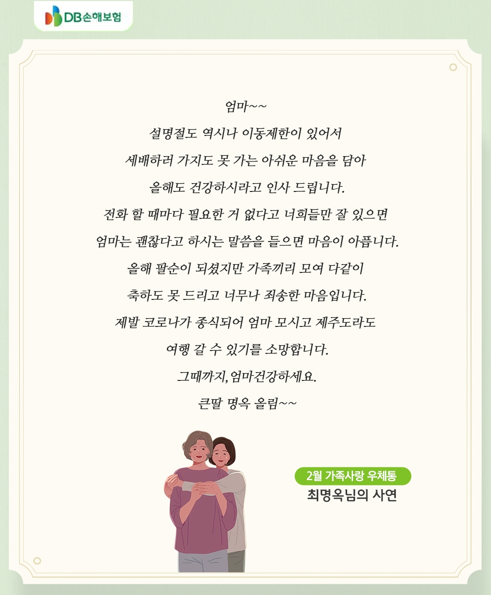 최명옥님은 코로나19로 찾아 뵙지 못하는 어머니께 미안함을 담아 편지를 쓰셨는데요. 자식들만 잘 지내고 있으면 나는 괜찮다고 말씀하신 어머니의 사랑이 글 너머로 느껴지는 것 같습니다. 올해에는 꼭 어머니와 같이 제주도 여행 가셔서 좋은 시간 보내실 수 있길 기도하겠습니다!
