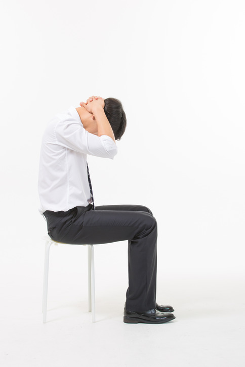2. 의자에 앉을 때 엉덩이를 의자 깊숙히 앉고, 등받이에 등을 닿아도 뒤통수와 어깨가 의자에 붙지 않고 머리가 앞으로 나갈 때