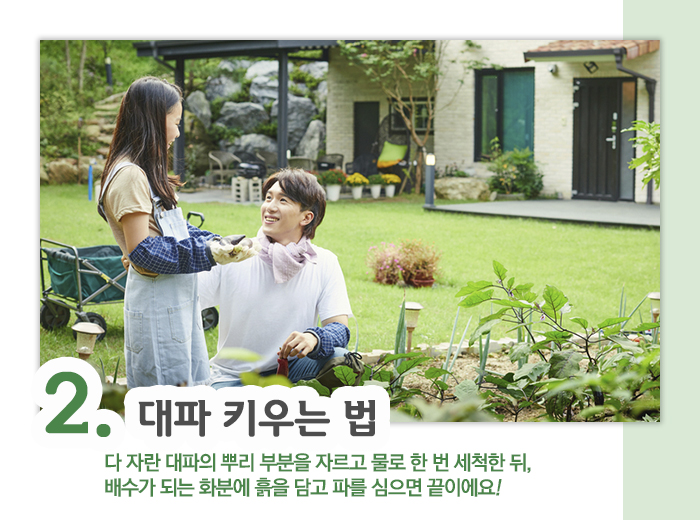 또한 흙이 아닌 물에서도 간편하게 대파를 키울 수 있는데요. 물에서 키울 때는 차가운 수돗물에 대파 뿌리를 담가놓고 물을 매일 갈아주어야 합니다. 다만 흙에서 자라는 것보다는 속도가 더디며 물을 자주 안 갈아주면 냄새가 날 수도 있으니 유의하세요. :D