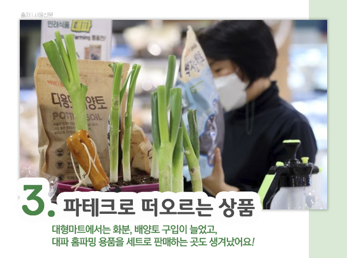 파테크 열풍과 함께 반려식물과 관련한 '홈파밍(집+농사)' '베란다 농사' 도구도 덩달아 떠오르고 있는데요. 대형마트에서는 화분 매출이 35~46%, 배양토도 36% 더 늘었고, ‘대파 홈 파밍 용품전'을 열어 대형 화분과 배양토 등을 세트로 판매하는 곳도 생겨났다고 합니다. 파테크에 도전해보실 분들에겐 좋은 소식이겠죠?