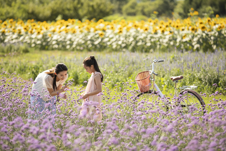 아름답게 핀 꽃들을 배경으로 하는 것만으로도 화사한 가족사진을 찍을 수 있는데요. 여기에 순광(정면에서 비추는 빛)과 역광을 활용하면 다양한 느낌과 감성까지 더할 수 있습니다. 순광은 인물과 꽃의 색이 가장 선명하고 정확하게 나오는데요. 광량이 충분한 시간대에 활용하시면 좋습니다.
