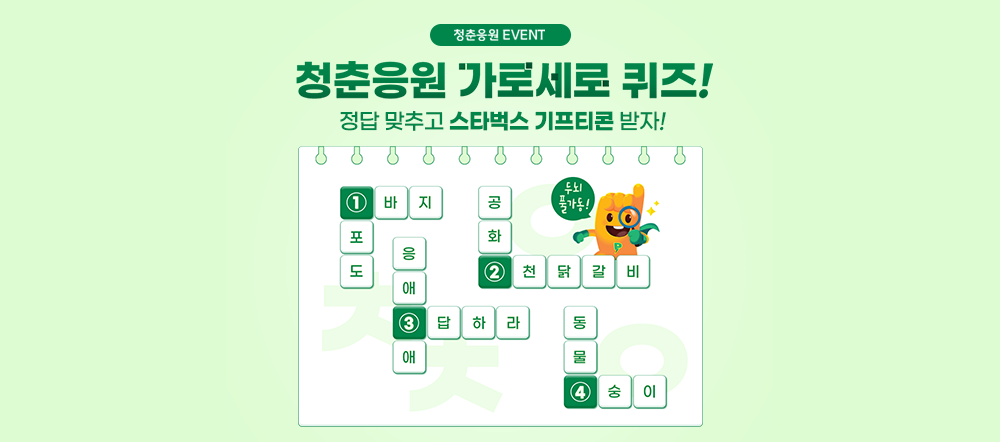 4월을 맞이하여 진행되는 이번 이벤트는, 순서대로 빈칸을 채우는 ‘청춘응원 가로세로 퀴즈!’ 이벤트 인데요. 꾸벅꾸벅 잠이 쏟아지는 봄! 두뇌를 깨워줄 가로세로 낱말 퀴즈! 이벤트 참여하시고, 행운 가득한 상품도 받아보시면 어떨까요?