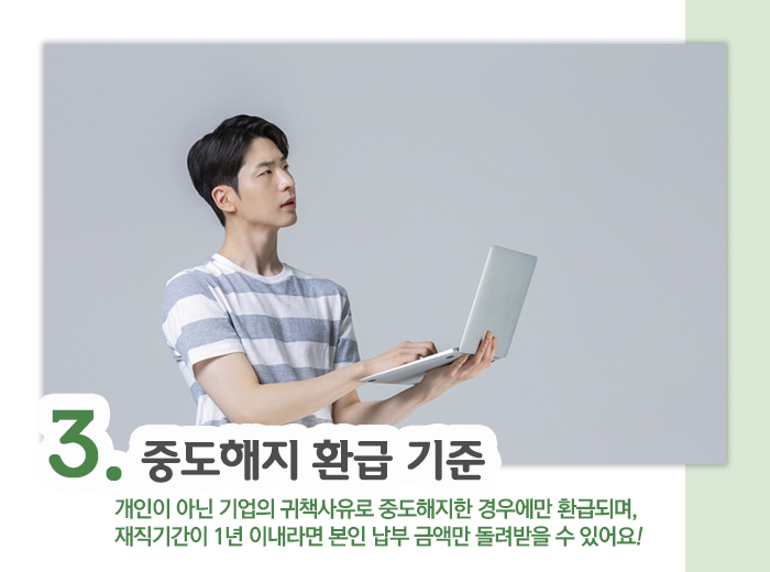 개인의 사유가 아닌, 기업 귀책사유로 중도해지한 경우에만 환급금이 지급되는데요. 기존에는 기업의 사유로 해지하더라도 가입 기간이 1년 이상인 경우 환급이 진행되는 방식이었지만, 올해는 코로나로 인한 휴업, 폐업이 늘어남에 따라 가입자의 귀책사유가 아니라면 중도 해지 시 1년 미만 근무자여도 환급이 가능합니다.