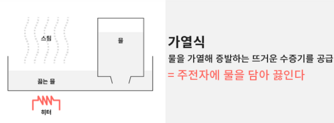 단점은 세척이 힘들다는 점인데요. 물을 가열하는 과정에서 살균 효과가 있기 때문에 청소를 매번 안 해도 되지만 복잡한 구조 때문에 청소가 쉽지 않습니다. 높은 소비전력 및 고온의 수증기가 나오기 때문에 아이가 있을 시 주의해서 사용하세요.