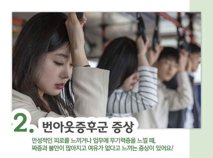 나른하고 더워진 날씨에 ‘무기력감’을 느끼는 분들 많이 계실 텐데요. 하지만 날씨 때문이 아니라 ‘과도한 업무로 인한 무기력증’일 수도 있다는 사실! 계속되는 야근이나 과중한 업무에 주말에도 쉬지 못해 무기력증과 만성피로를 느끼신다면 ‘번아웃증후군’이 아닌지 의심해봐야 합니다. 직장인의 건강을 위협하는 번아웃증후군, 오늘 자세히 알아보도록 하겠습니다.