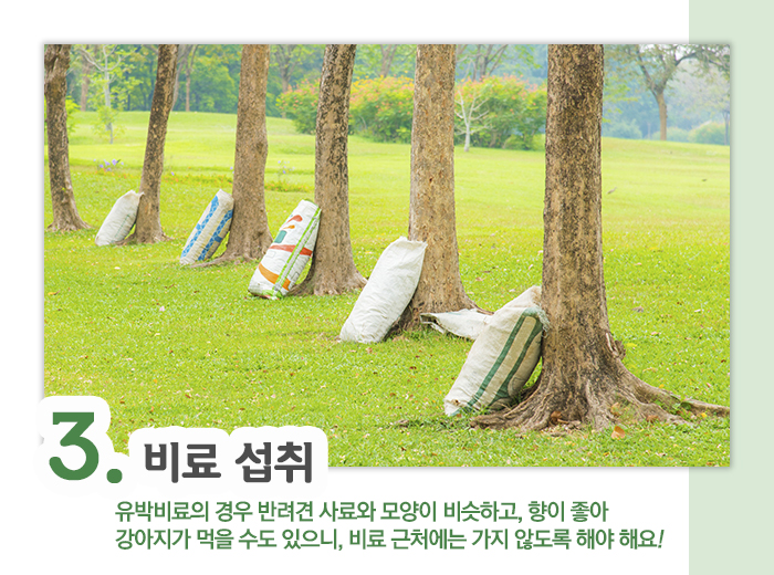 비료는 위험한 성분이 많아 반려견이 섭취해선 안 되는데요. 특히 공원이나 공터, 산 등지에 식물을 재배하는 곳에서 사용되는 ‘유박비료’는 소량만 섭취해도 사망에 이를 수 있습니다. 모양도 반려견 사료와 비슷해 반려견들이 이를 착각하고 먹는 경우가 종종 있다고 하니, 산책 시 반려견이 비료 근처에 가지 않도록 유심히 살펴보기! 만약 비료를 섭취 했다면 빠른 시간 내 동물병원을 찾아 응급처치를 받아야 합니다.