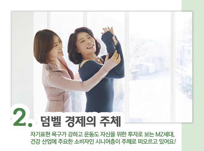 덤벨 경제 확산의 주체는 'MZ세대'입니다. 워라밸을 중요시하는 MZ세대는 자기표현의 욕구가 강하고, 멋진 몸매를 가지기 위해 운동을 하는 것도 자신에 대한 투자로 보는데요. 또한 스마트워치 등 건강 관리 앱을 비롯하여 기능성 건강보조식품과 운동 보조기구, 스포츠웨어 등 관련 산업에 대한 다양한 관심을 보이고 있어 덤벨 경제의 새로운 주축으로 떠오르고 있습니다.