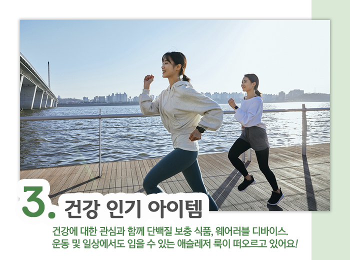 요가나 필라테스, 헬스 등 특정 운동 시에만 입었던 레깅스, 크롭 티셔츠 등을 일상에서도 패션으로 즐기는 요즘인데요. 운동은 물론 일상복으로도 입기 편한 옷을 말하는 ‘애슬레저 룩’은 스타일과 기능, 두 가지 모두를 만족시키며 뉴 노멀 패션으로 떠오르고 있습니다. 패션업체와 스포츠웨어 브랜드도 애슬레저 시장에 속속 뛰어들고 있어 시장 전망성은 더욱 밝아질 예정입니다.