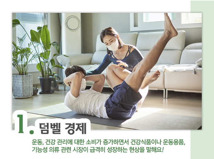 '덤벨 경제'는 운동 기구인 ‘아령(dumbbell)’을 경제 현상에 덧붙인 말인데요. 운동 등 건강과 체력관리에 대한 소비가 증가하면서 건강식품이나 운동용품, 기능성 의류 관련 시장이 급격히 성장하는 현상을 말합니다. 주 52시간 근무제 도입과 워라밸이 확산으로 시장규모는 더욱 커져가고 있는데요. 특히 올해는 코로나 19로 인해 집에서 운동하는 ‘홈트족’이 늘면서 주요 소비층이 더 확대되었습니다.