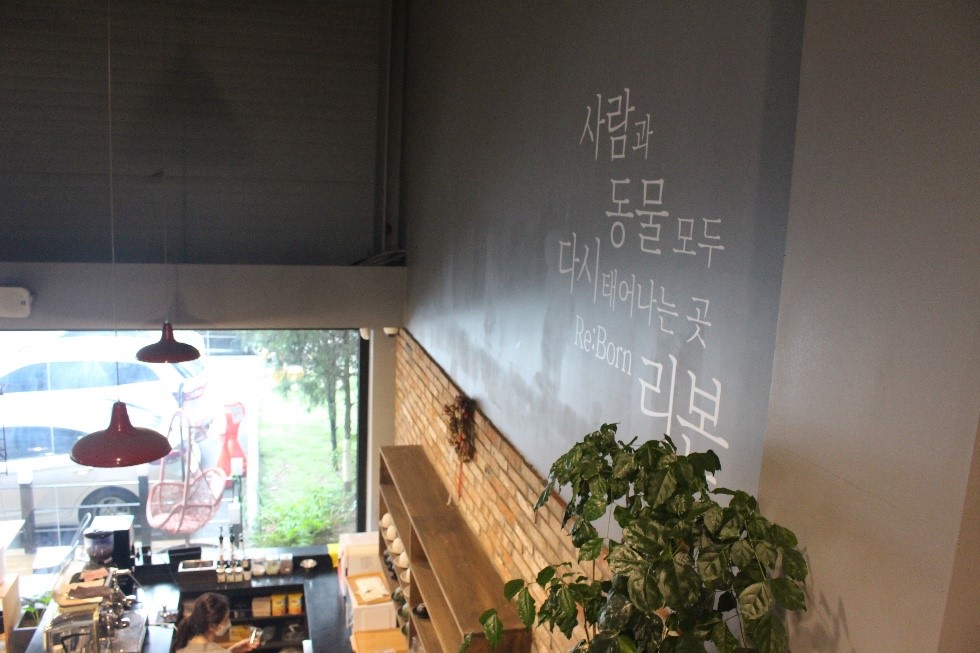 센터 소개를 하면 1층에는 유기견을 수용하는 분양센터와 유기견 놀이터, 리본 카페가 있어요!