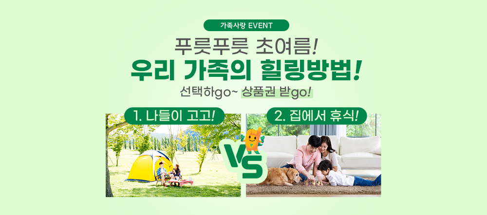 6월을 맞이하여 진행되는 이번 이벤트는, 푸릇푸릇 초여름! 우리 가족의 힐링방법을 선택하는 가족사랑 이벤트 인데요. 우리 가족의 힐링방법은 무엇인지 댓글로 남기고 상품권도 받고! 가족과 함께 행복한 6월 보내세요♡
