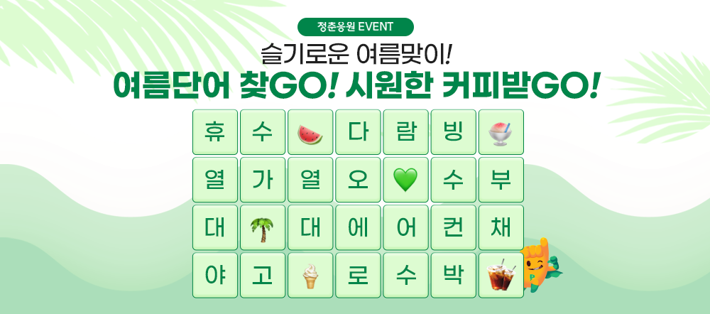 6월을 맞이하여 진행되는 이번 이벤트는, 여름 더위를 날려줄 ‘여름단어 찾GO! 시원한 커피받GO!’’ 이벤트 인데요. 글자 속에 숨겨진 여름과 관련된 단어 3개를 찾아 댓글을 남기시고, 행운 가득한 상품도 받아보세요!