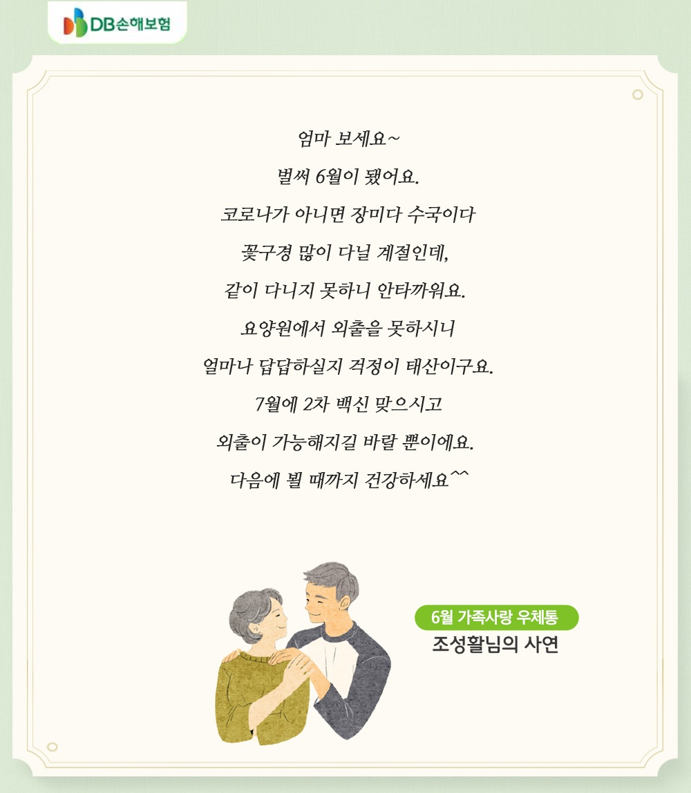 지금까지 DB손해보험 가족사랑 우체통 베스트 사연을 함께 살펴보았습니다. 이번 가족사랑 우체통 편지에서는 6월을 맞아 가족들에게 사랑을 전하는 가족메시지들을 볼 수 있었는데요. 아직 가족들에게 마음을 전하지 못했다면 가족사랑 우체통 편지를 보내 보는 건 어떨까요?