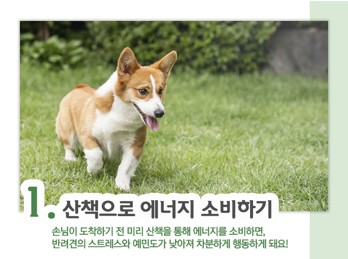 손님의 방문에 반려견이 흥분하는 타입이라면, 손님이 도착하기 전 미리 산책을 통해 에너지를 발산하게 해주세요! 장난감을 좋아하는 반려견이라면 야외에서 장난감을 이용해 놀아주면 더욱 좋겠죠? 산책을 통해 스트레스와 예민도가 낮아지는 만큼 손님에게 평소보다 부드럽고 차분하게 행동하게 된답니다.