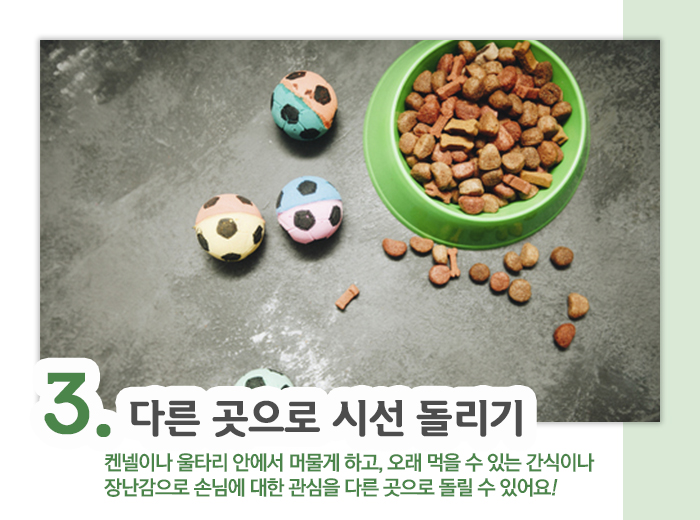 손님에게 대한 관심 대신 다른 곳에 집중할 무언가를 제공하는 것도 좋은데요. 켄넬이나 울타리 안에 반려견을 머물게 해 평소 좋아하거나 오래 먹을 수 있는 간식이나 장난감을 주어 손님이 아닌 다른 곳에 집중하게 하면 흥분도를 이전보다 낮출 수 있답니다.