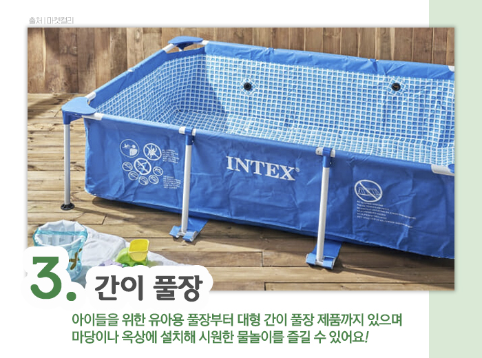바닷가를 가지 못해 아쉬운 분들이 있으시다면, 아이들을 위한 유아용 풀장부터 대형 간이 풀장 제품을 이용해보세요. 마당이나 옥상에 풀장을 설치해 물을 받아놓고 내리쬐는 햇볕과 함께 시원하게 물놀이를 즐겨보세요! 여름 더위를 싹 날려버리실 수 있답니다.