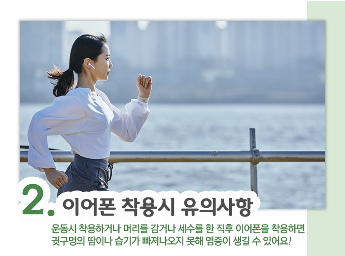 운동을 하는 동안 체온이 높아지면 귓속에서도 땀을 배출하게 되는데, 만약 이때 이어폰을 착용하고 있으면 귓속의 땀의 배출이 잘되지 않아 귓속에 염증을 유발할 수 있기 때문입니다.