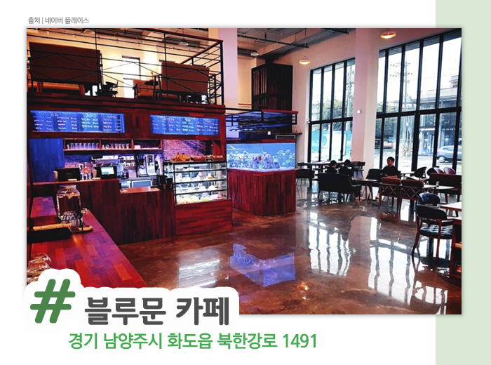 남양주에 위치한 ‘블루문’ 카페는 평내호평역에서 차로 15분 거리에 위치해 있는데요. 2층은 편안히 이야기를 나눌 수 있는 공간, 1층은 주문하는 곳과 함께 수족관을 옮겨 놓아 커피를 마시며 다양한 물고기들을 관람할 수 있습니다.