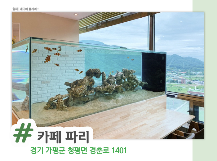 마지막 장소는 경기도 가평군에 위치한 ‘카페 파리’인데요. 건물 옥상의 에펠탑 조형물이 시선을 사로잡는 이곳은 12층에 위치해 있어 아름다운 가평의 경치를 한 눈에 내려다 볼 수 있고 여러 물고기들도 만나볼 수 있는 아쿠아리움 컨셉의 카페입니다.