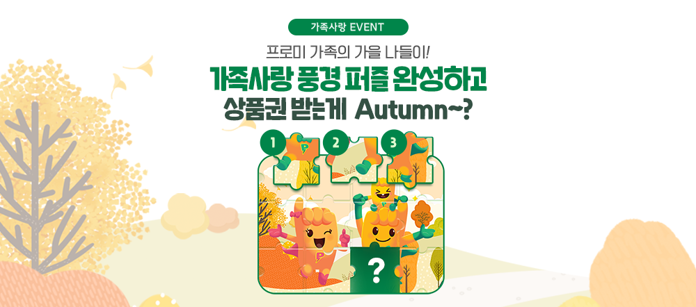 9월을 맞이하여 진행되는 이번 이벤트는, 프로미 가족의 가을 나들이! 가족사랑 풍경 퍼즐을 완성하는 가족사랑 이벤트 인데요. 물음표 위치에 꼭 맞는 퍼즐을 찾아 정답을 댓글로 남기고 신세계 상품권도 받고! 가족과 함께 행복한 9월 보내세요♡