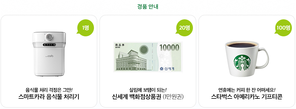 추석을 맞아 풍성한 선물도 준비했는데요! 참여자 중 추첨을 통해 스마트카라 음식물 처리기(1명), 신세계 백화점상품권 1만원권(20명), 스타벅스 아메리카노 TALL(100명)을 드리니 9월 15일(수) ~ 9월 26일(일) 이벤트 기간 놓치지 마시고 꼭 참여하세요~!