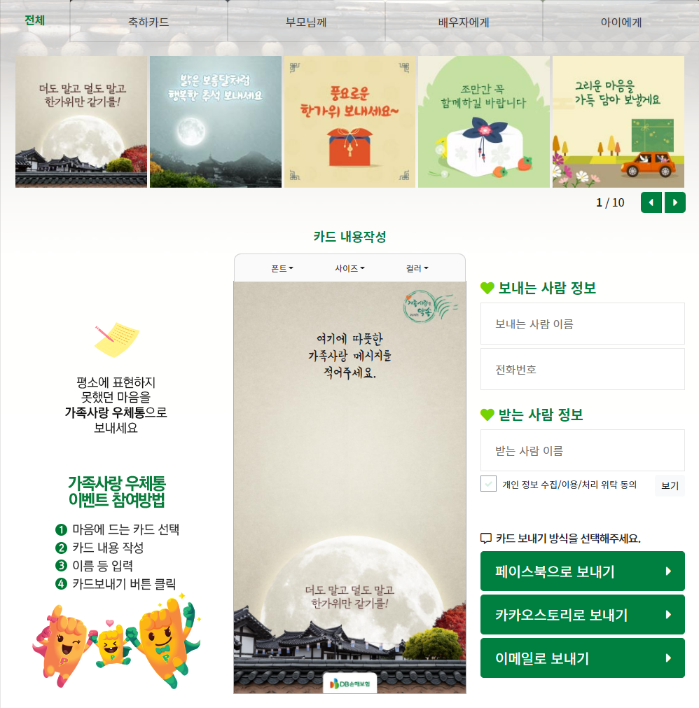 추석 가족사랑 우체통 9월 카드 보내기 이벤트는 DB손해보험 가족사랑 브랜드 사이트 또는 모바일 사이트에서 참여가 가능하니, 아래 링크 클릭하셔서 이벤트 참여해 보세요^^!