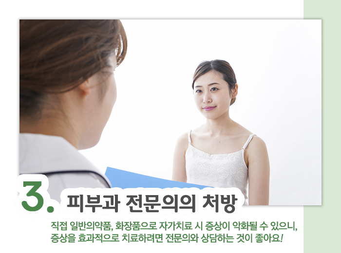 증상을 효과적으로 치료하기 위해서는 피부과 전문의의 진료를 받으시고 전문의약품을 처방받는 게 좋습니다. 직접 약국에서 일반의약품을 구입해 사용하시거나 화장품 등으로 자가치료를 하시다가 더 악화되는 경우가 많다고 하니 유의하는 게 좋겠죠?