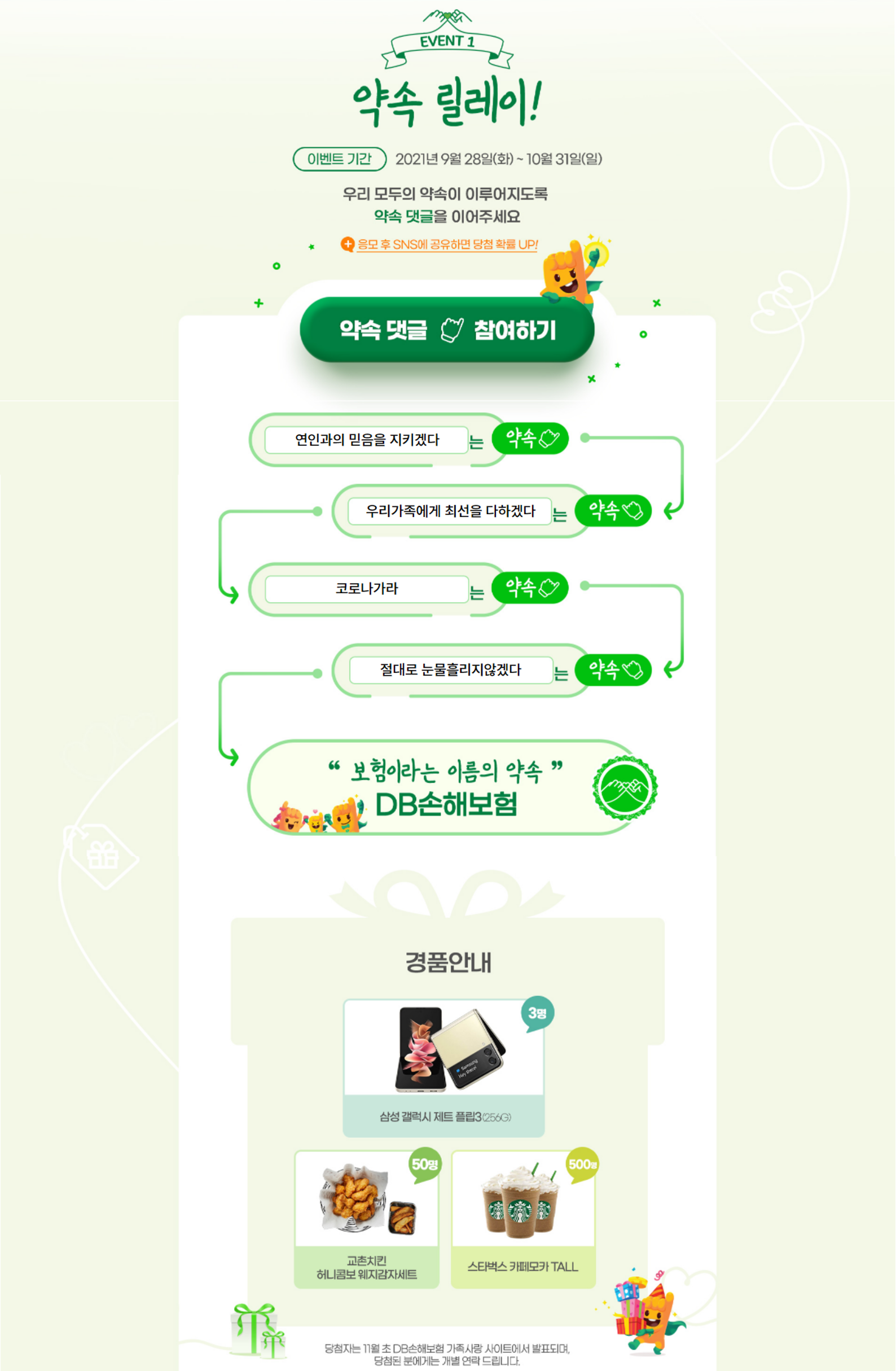 약속 릴레이 경품은 삼성 갤럭시 제트 플립3(3명), 교촌치킨 허니콤보 웨지감자세트(50명), 스타벅스 카페모카 TALL(500명)를 추첨하여 드려요!