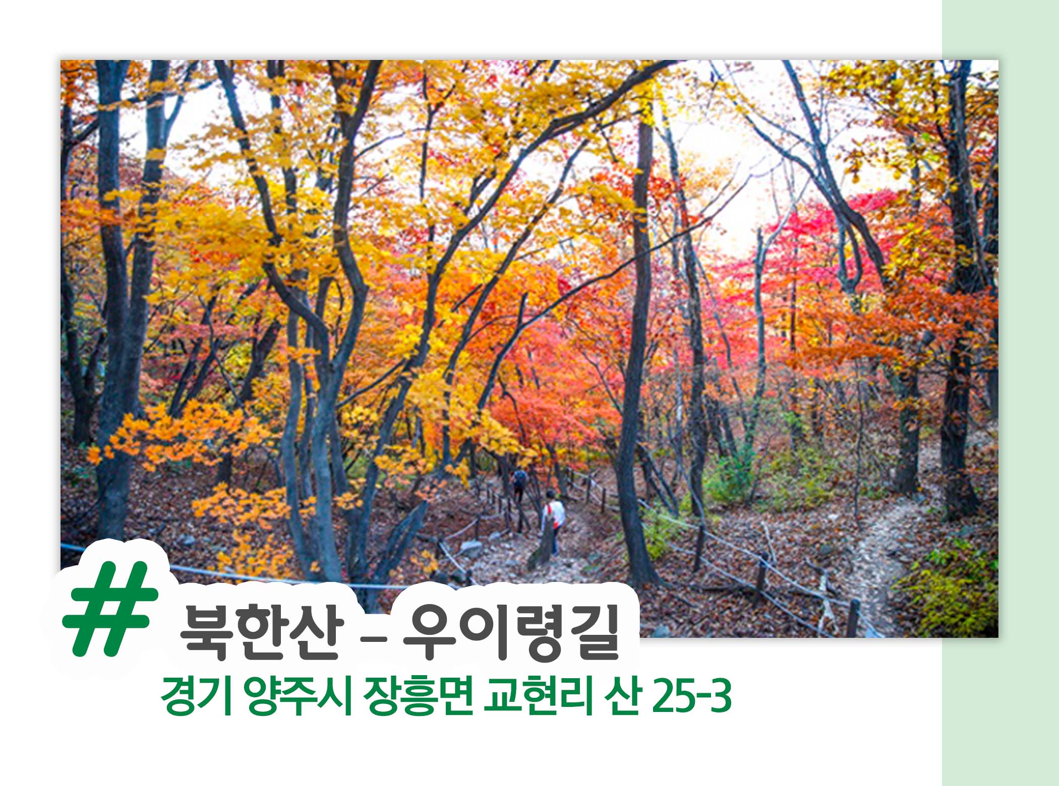 두 번째 탐방로는 북한산 우이령 길인데요, 산길이지만 길이 넓고 험한 구간이 없어 온 가족이 함께 단풍 구경하며 걷기 좋은 탐방로입니다. 1968년 북한 무장공비가 청와대를 침투하려 했던 사건 이후 민간인 출입이 전면 금지되었다가 2009년부터 탐방 예약제로 개방된 곳인데요. 우이령 길에는 가을의 꽃, 단풍이 가득한 '가을 단풍 길'이 있어 방문객들의 발걸음이 끊이지 않는다고 합니다. 또한 우이령 길 탐방 시에는 신분증지참이 필수라고 하니 이 점 참고해 주세요!