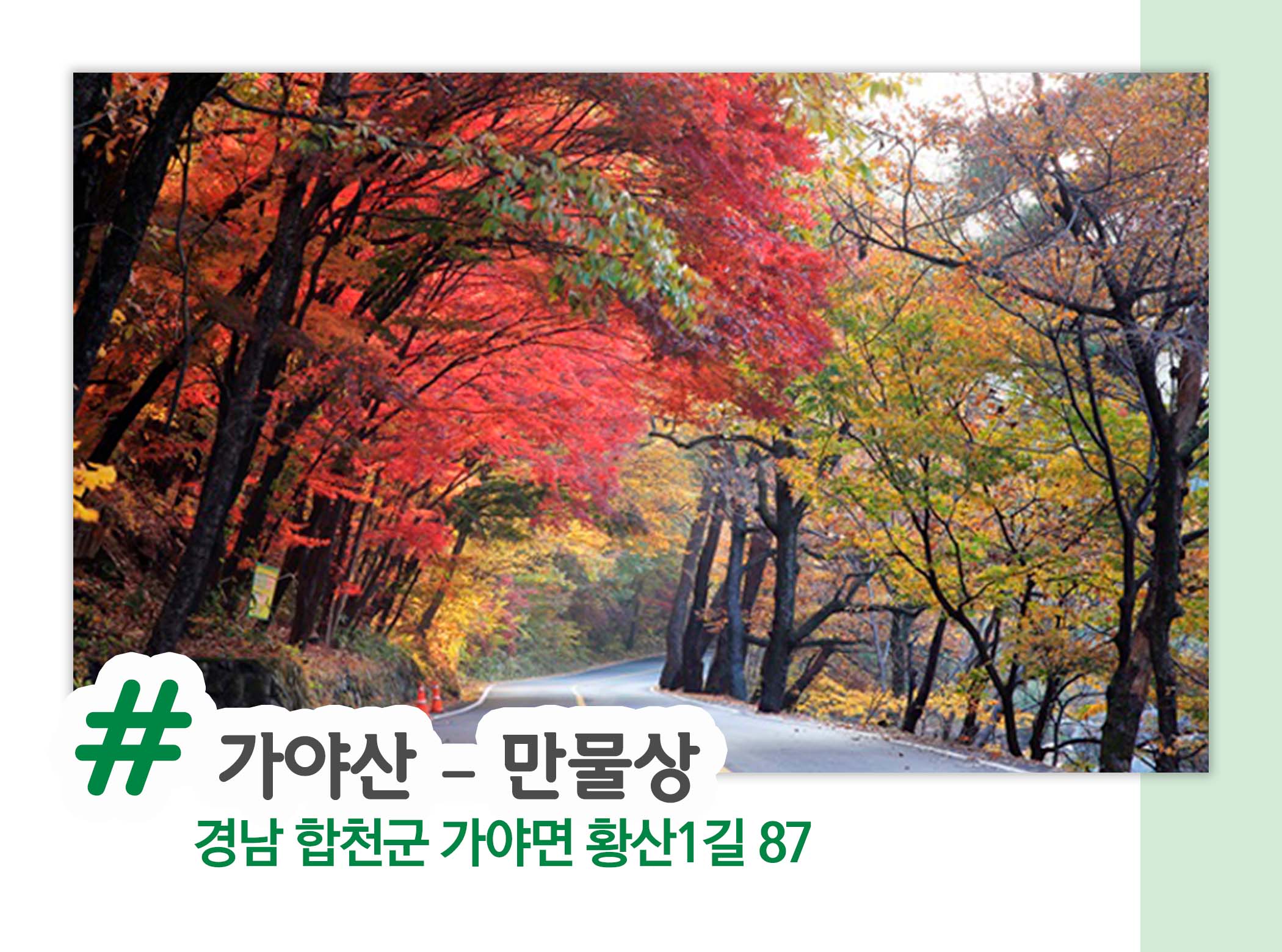 마지막 탐방로는 가야산 만물상입니다. 이곳은 조선 8경의 하나로 빼어난 산새를 자랑하는 곳인데요. 사계절 내내 사람들이 많이 찾는 장소이지만 그중 가을에 가장 많이 찾는 단풍 명산이라고 합니다. 만물상 탐방로는 높낮이가 다양한 산봉우리가 이어져있어 아름다운 능선을 따라 물드는 단풍을 구경할 수 있다는 점이 특징인데요. 현재는 자연생태계 보호를 위해 수용인원을 기존보다 축소하여 운영하고 있으니 빠르게 예약해 즐거운 단풍 구경 하시길 바랄게요!