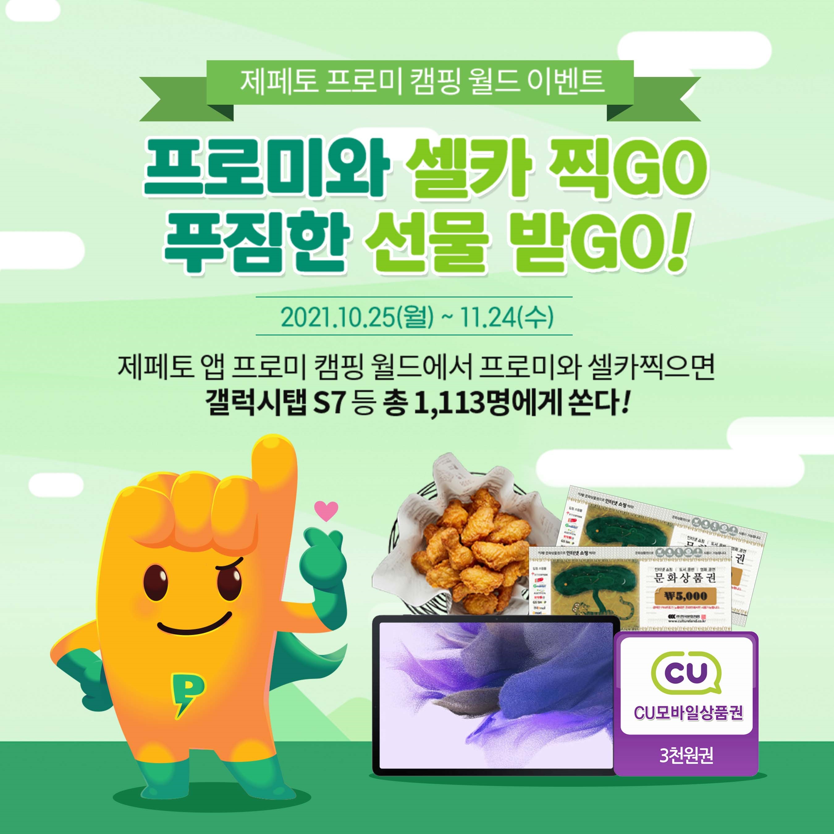 프로미캠핑월드 오픈을 기념해 푸짐한 경품도 준비했는데요! 이벤트 참여자들에게는 추첨을 통해 갤럭시 탭 S7 3명, 교촌치킨 허니콤보 웨지감자세트 10명, 컬처랜드 모바일 상품권 100명, CU편의점 상품권 1,000명에게 드리니 2021년 10월 25일 ~ 2021년 11월 24일 이벤트기간 놓치지 마시고 꼭 참여하세요~!