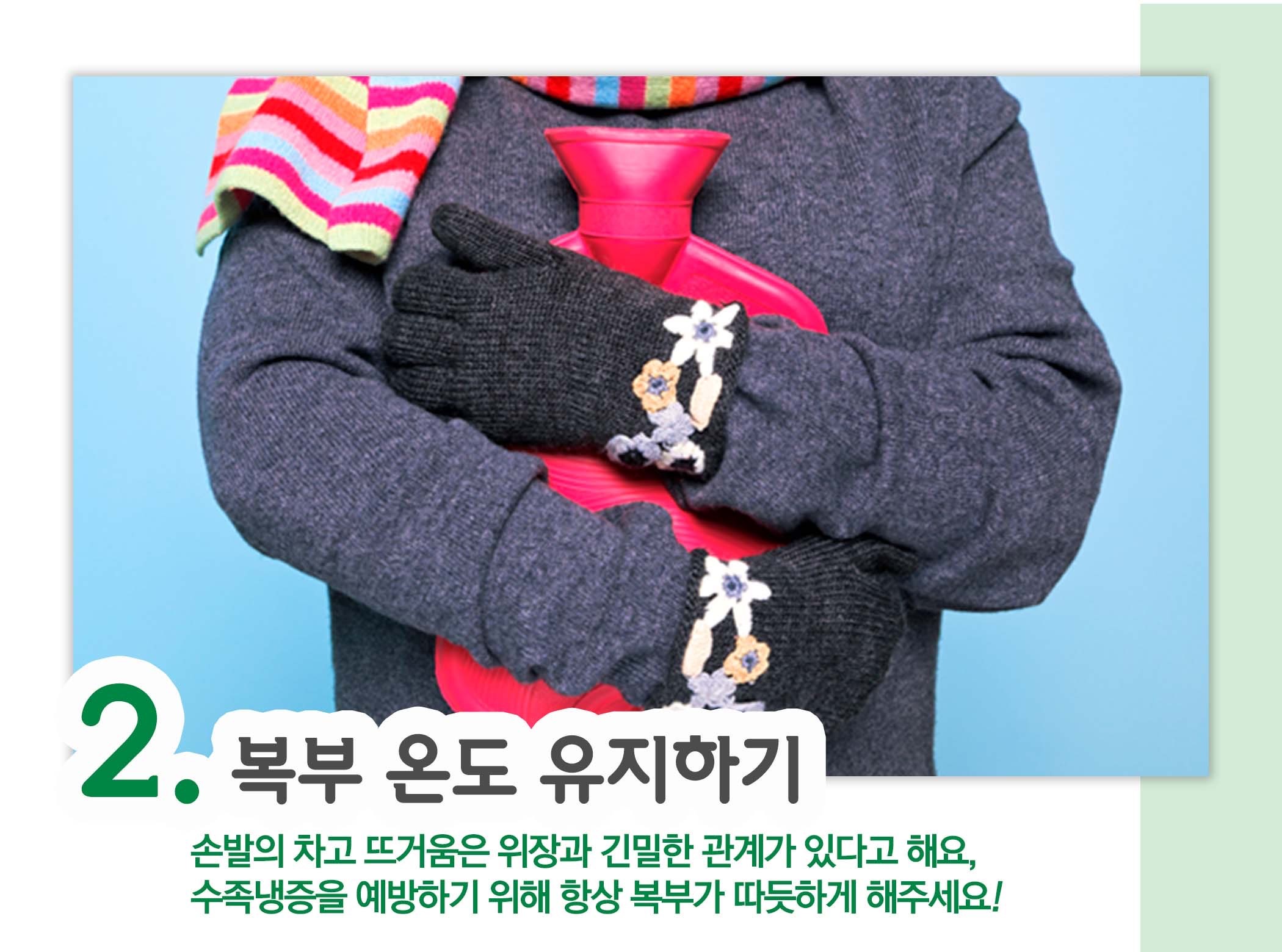 손과 발의 차고 뜨거움은 위장과 긴밀한 관계가 있다고 해요. 즉 위장의 기능이 냉증을 가져올 수 있기 때문에 수족냉증을 예방하려면 복부를 따듯하게 하는 것이 도움이 된다고 합니다. 수족냉증이 손끝, 발끝이 차가워지는 증상이기 때문에 몸의 말초를 따듯하게 하려는 시도를 많이 하는데요. 말초혈관이 아닌 몸의 중심인 복부의 온도를 유지하는 것이 무엇보다 중요하다고 하니 복부가 항상 따듯할 수 있도록 신경 써 주세요!