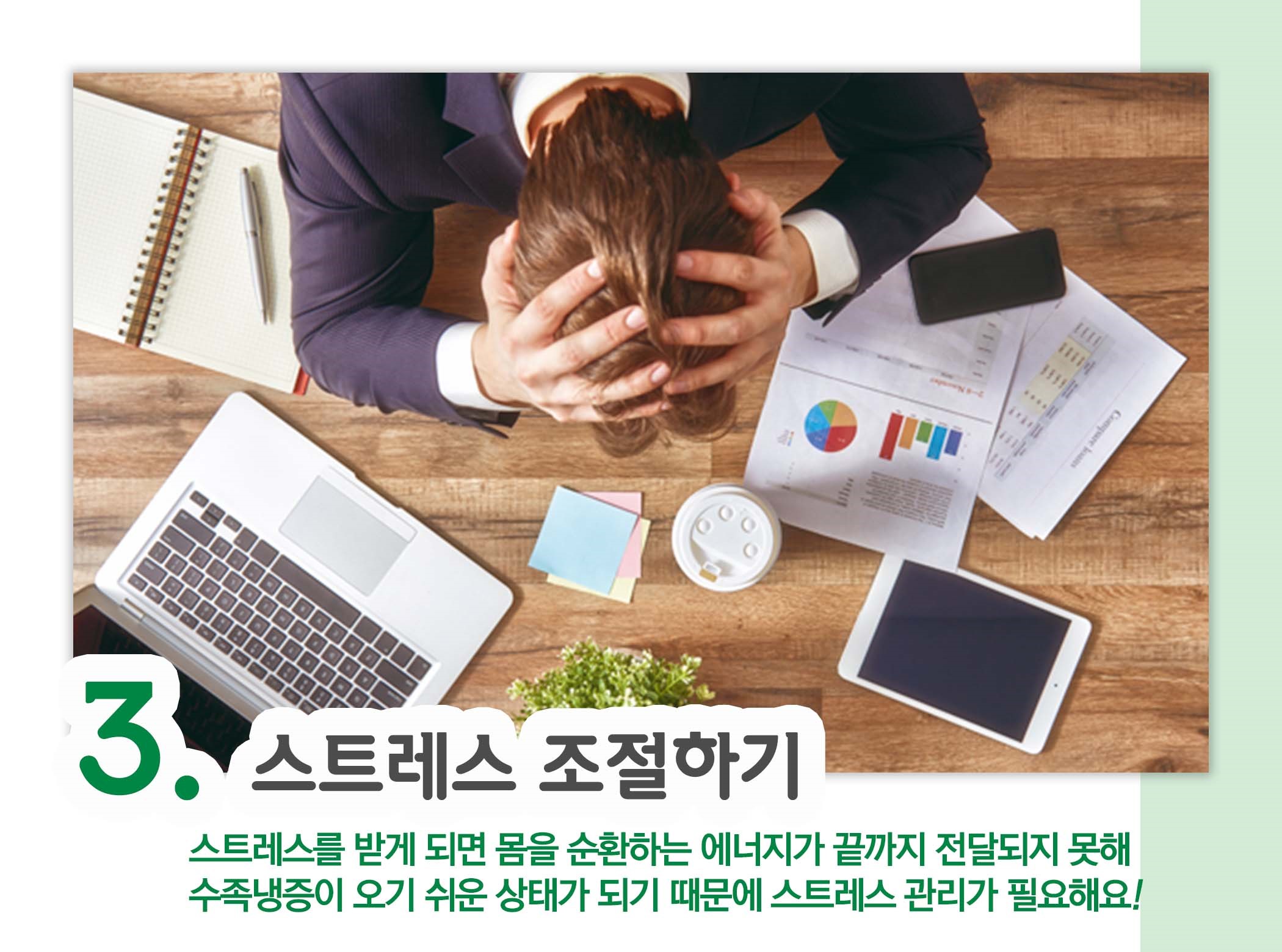 수족냉증을 예방하기 위해서는 스트레스 관리도 중요한데요. 스트레스를 받게 되면 몸이 과부하 상태가 되어버립니다. 전신을 순환해야 하는 에너지가 우리의 몸 끝까지 전달되지 못해서 수족냉증이 온다는 말인데요. 때문에 스트레스를 조절하는 능력을 기르는 것이 중요합니다. 복식호흡은 스트레스를 완화시키는데 많은 도움이 되기 때문에 가장 쉽게 관리할 수 있는 호흡법으로 수족냉증을 예방해보아요! 하지만 스트레스를 받기 전 미리 예방하는 것이 가장 중요한데요. 운동이나, 휴식 등 자신만의 스트레스 푸는 방법을 찾아서 미리 관리하는 것이 가장 좋은 방법이겠죠?