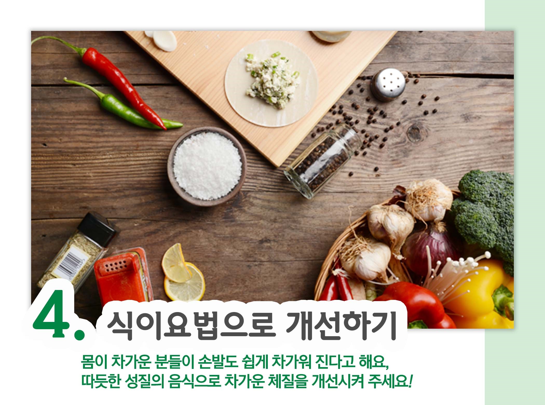 마지막으로 소개해드릴 수족냉증 관리 방법은 따듯한 음식으로 차가운 체질을 개선하는 방법입니다. 기본적으로 몸이 차가운 분들이 손발도 차가운 경우가 많은데요. 따듯한 음식을 먹어 몸 안의 냉기를 없애고 열기를 채우는 방법이 가장 좋습니다. 채소 중 가장 따듯한 성질을 가진 부추와 마늘, 모세혈관의 혈액순환을 돕는 계피, 따듯한 기운을 저장하는 효능이 있는 생강 등 몸의 열기를 높이는 음식들을 잘 기억하셨다가 수족냉증 개선을 위해 참고하시면 좋을 것 같아요.