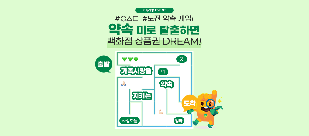 11월을 맞이하여 진행되는 이번 이벤트는, 도전 약속 게임! 약속 미로를 탈출하는 가족사랑 이벤트 인데요. 미로를 탈출하며 만나게 되는 약속문장을 찾아서 댓글로 남기고 신세계 상품권도 받고! 가족과 함께 행복한 11월 보내세요♡