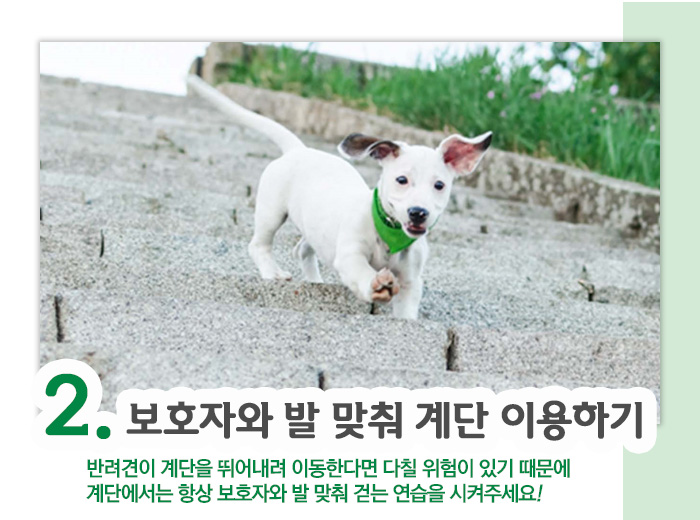 반려견들은 불안감 때문에 빨리 계단을 벗어나고자 하는데요. 빠르게 이동 하다보면 보호자나 반려견이 넘어지면서 부상은 물론, 다른 사람들과 부딪치며 2차 사고로도 이어질 수도 있는 만큼 계단에서는 항상 보호자와 발을 맞춰 걸어야 합니다.