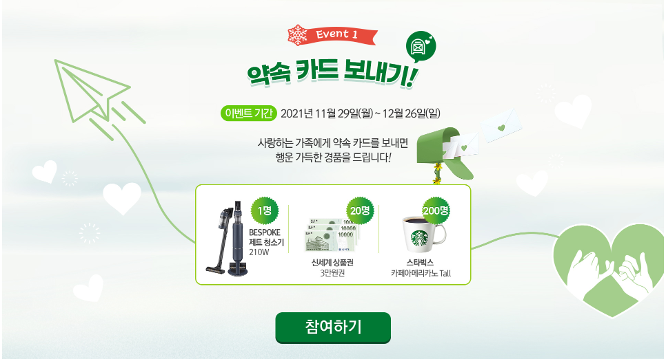 약속 카드 보내기 경품은 BESPOKE 제트 청소기 210W(1명), 신세계 상품권 3만원권(20명), 스타벅스 아메리카노 TALL(200명)를 추첨하여 드려요~!