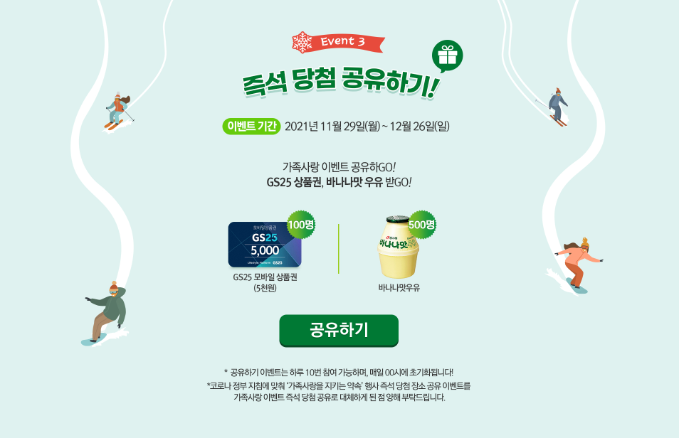 즉석 당첨 공유하기 경품은 GS25상품권, 5,000원권(100명), 빙그레 바나나 우유(500명)를 추첨하여 드려요!